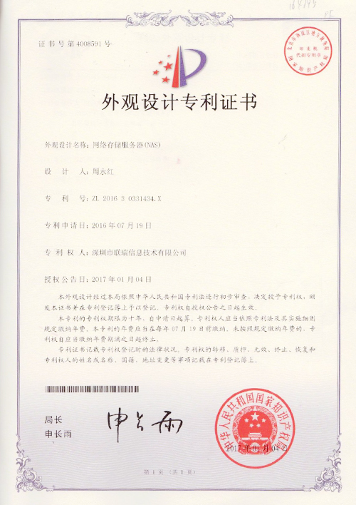 ?????? 上述外觀設計專利產品用于網絡存儲設備,目前已在公司生產的硬盤陣列柜和網絡存儲設備等產品中。在實際運用中具有一定的美觀性、通用性和實用性,且通過優(yōu)化合理設計使生產成本得到有效降低。